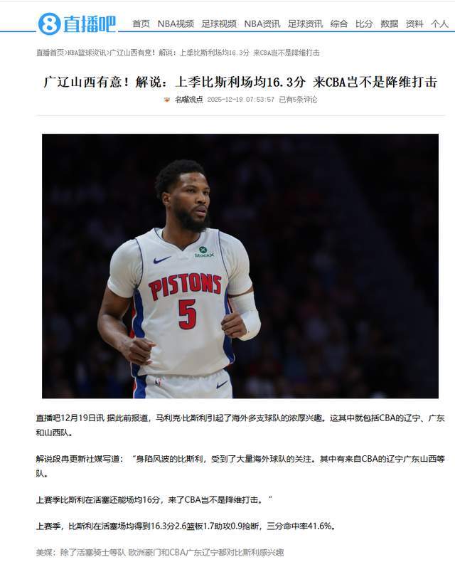根據解說段冉在社交平台透露:“身陷風波的比斯利,受到了大量海外球隊的關注。其中有來自CBA的遼寧廣東山西等隊。上賽季比斯利在活塞還能場均16分,來了CBA豈不是降維打擊。”另有消息說,歐洲聯賽的貝爾格萊遊擊、皇家馬德裏和拜仁慕尼黑等,對比斯利也充滿興趣。